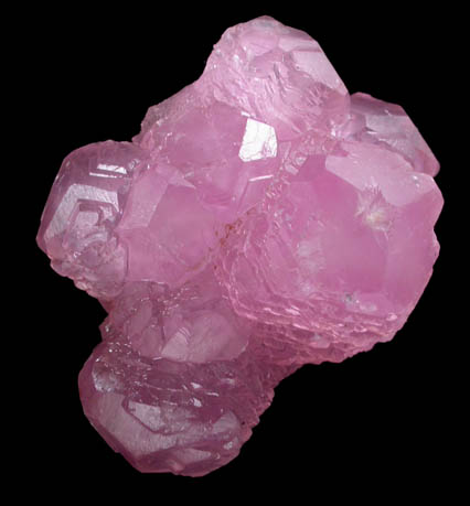 | Description: | Vivid-pink transparent-to-translucent calcite crystals with minor translucent brown andradite garnet crystals to 1 mm included in the base where attached. The calcite crystals have rhombohedral termination faces and compound prism faces. |