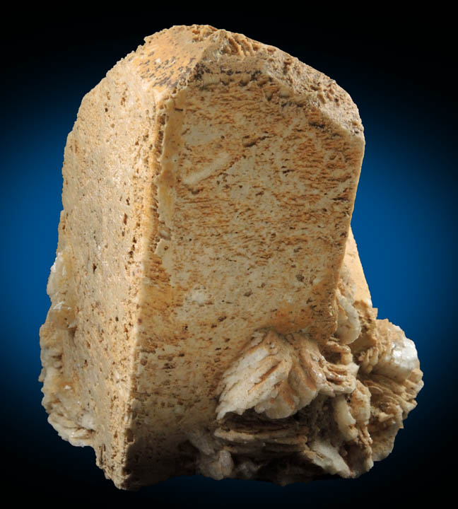 | Description: | Large blocky white microcline crystals to 70 mm with brown surfaces plus a few lustrous bladed white albite crystals to 8 mm around the base. The microcline are twinned diagonally through the center following the Baveno Law of feldspar twinning. Ex. Thomas A. Penney (1934-2019) collection #376, collected in the 1960s-70s |