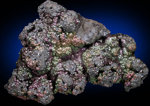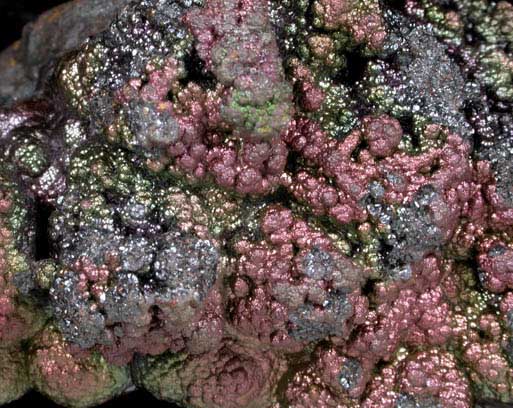 | Description: | Botryoidal hematite crystals to in rounded aggregates to 10 mm diameter with colorful iridescent turgite (altered hematite-goethite) surfaces that vary from green to pink. Ex. Thomas A. Penney (1934-2019) collection #333 |