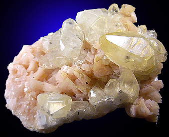 | Description: | Golden transparent scalenohedral crystals of calcite to 3 cm long on pink dolomite crystals to 5 mm. This locality has been closed for many years, though a few specimens have recently become available. Ex. Swigert collection #1603 |