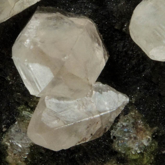 | Description: | Transparent colorless cerussite crystals to 6 mm on dark brown-black mottramite microcrystals on one face of white calcite. The cerussite crystals have silky luster due to parallel microscopic crystal faces and many of the crystals are twinned at 60°. Ex. E. Carmichael collection |