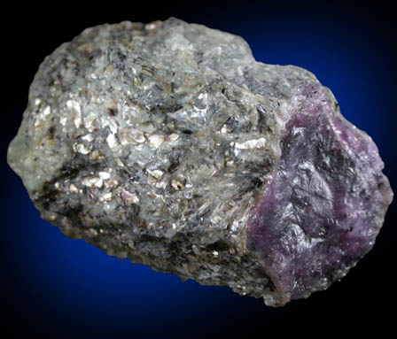 | Description: | Half of a translucent pink sapphire crystal with an outer rind of margarite-phlogopite. One end has a fresh exposure showing the interior color of the sapphire crystal. |