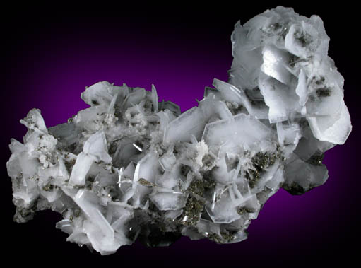 | Description: | Cluster of many intersecting thin hexagonal colorless calcite crystals to 15 mm with yellow-metallic pyrite microcrystals in some areas. The calcite crystals are translucent with transparent outer edges. |