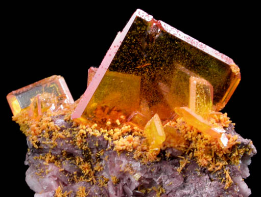 | Description: | Lustrous transparent orange wulfenite crystals to 11 mm with powdery yellow mimetite microcrystals on gray barite. |