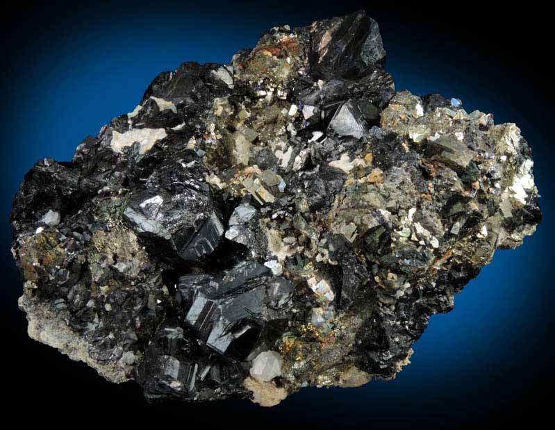 | Description: | Lustrous black sphalerite crystals to 14 mm intermixed with lustrous yellow-metallic pyrite crystals to 4 mm on massive pyrite. Many of the sphalerite crystals are lamellar-twinned following the Spinel Law of twinning on the {111} octahedral plane. |