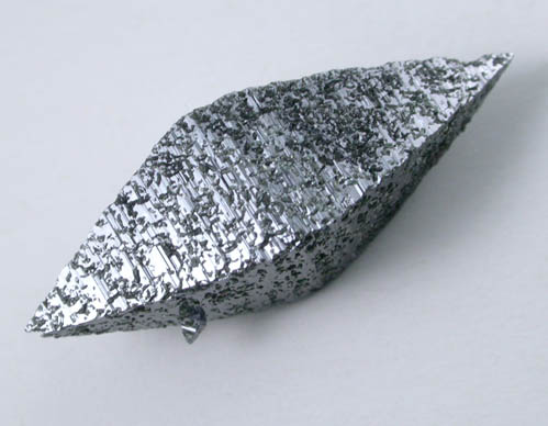 | Description: | Doubly-terminated elongated di-pyramidal gray anatase crystal with slightly striated crystal faces that have overgrowth of scattered 0.1-0.2 mm unidentified crystals, possibly anatase also. Collected ca. 1990 |