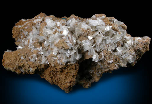 | Description: | Many translucent white bladed cerussite crystals in shallow cavities in translucent brown crystallized barite. The cerussite crystals have silky chatoyancy and are repeatedly twinned at 60° angles. Collected in 1990 |