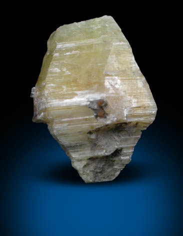 | Description: | Tapered translucent yellow hexagonal weloganite crystal with remnants of matrix on the surfaces where it was attached. The weloganite crystal has striated faces that resemble stacked plates. |