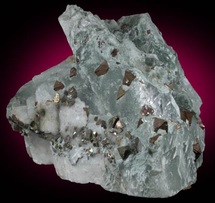 | Description: | Octahedral yellow-metallic pyrite crystals to 7 mm in translucent white calcite that is colored green by byssolite (variety of actinolite) inclusions. Ex. Thomas A. Penney (1934-2019) collection #300, collected in the 70s. |