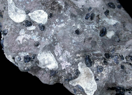 | Description: | Many lustrous transparent blue sapphire crystals, the colored gem variety of the mineral species corundum, to 1.5 mm exposed on the front and rear surfaces of gray matrix with vesicles lined with white zeolite crystals to 1 mm. |