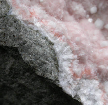 | Description: | Acicular pink-to-colorless natrolite crystals to 3 mm in hemispherical aggregates lining a cavity in gray basalt with scattered translucent white apophyllite crystals to 1 mm. |