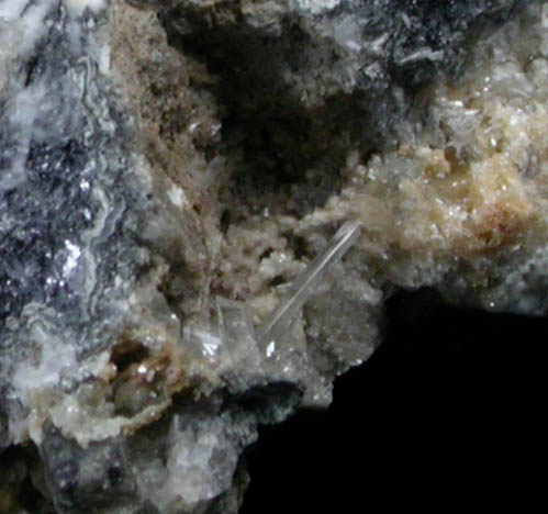 | Description: | Gray-metallic galena with many small cavities lined with colorless anglesite crystals. One pocket has a water-clear (transparent) colorless anglesite crystal 2.5 mm long prominently extending from the cavity wall. Ex. W. Keller #6019; ex. P. Freeman (UK) |