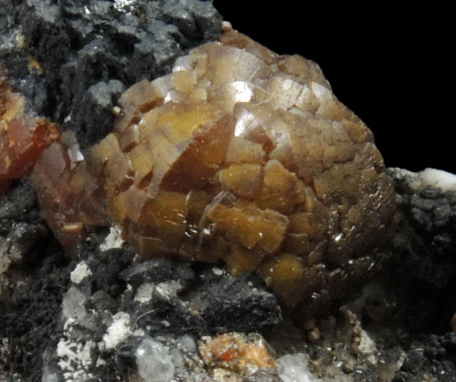 | Description: | Lustrous brown campylite crystals, the barrel-shaped variety of the mineral species mimetite, to 7 mm on white quartz with sooty black psilomelane microcrystals. Ex. W. Keller #7161; ex. P. Freeman (UK) |