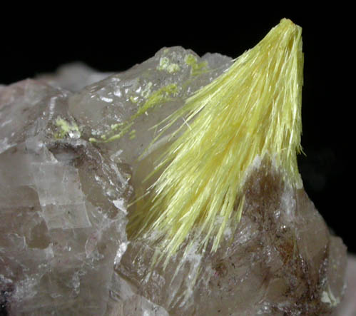 | Description: | Small tapered spray of acicular yellow uranophane crystals on crystallized matrix. |