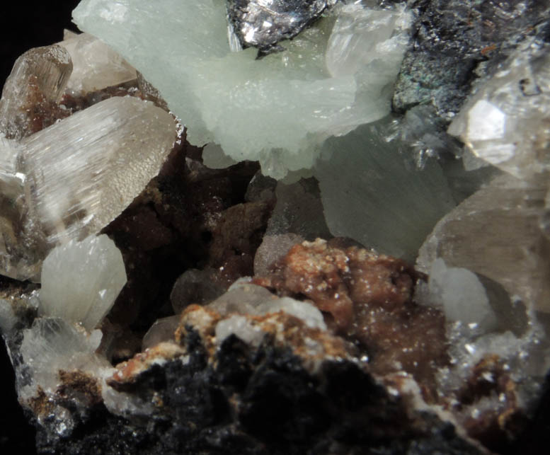 | Description: | A V-shaped cavity in gray-metallic galena lined with lustrous striated transparent pale-brown cerussite crystals to 10 mm with translucent pale-green smithsonite crystals to 10 mm and smaller lustrous brown rhombohedral calcite crystals to 0.5 mm. Ex. E. Carmichael collection, originally acquired from Excalibur Mineral Co. |