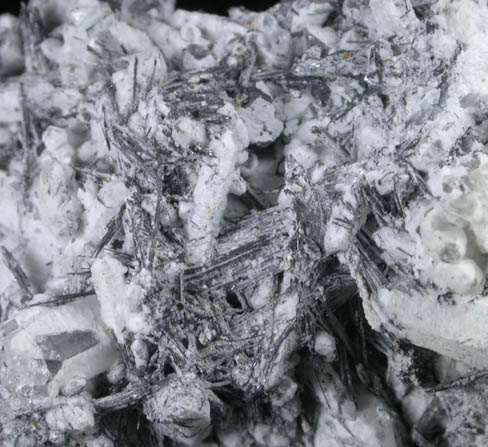 | Description: | Acicular dark-metallic cosalite crystals to 4 mm intermixed with milky white quartz crystals to 6 mm. Ex. A. Stevenson (1916-2007), originally acquired in Munich in 1992 |