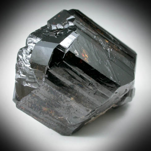 | Description: | Large lustrous translucent brown-black cassiterite crystal with remnants of muscovite mica on the underside. The cassiterite is repeatedly twinned resulting on complex parallel termination faces. |