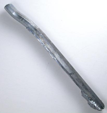 | Description: | Lustrous gray-metallic stibnite crystal with striated prism faces and pyramidal termination. Notice the reverse curvature of the stibnite crystal. One edge of the stibnite crystal has a contact where it intersected and adjacent stibnite crystal. Ex. B. Gaber collection #545; ex. Paul Pohwat collection #171 (Mineral Collection Manager at Smithsonian) |