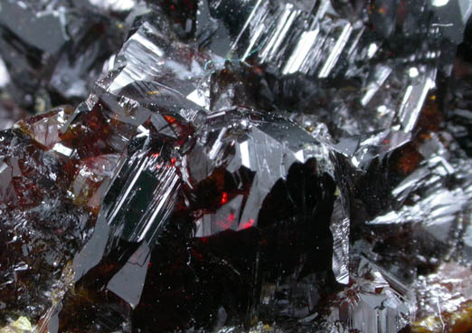 | Description: | Unusual formation of parallel sphalerite crystals that reflect illumination simultaneously off the crystal faces. The sphalerite crystals appear black but are actually transparent dark red-brown. Ex. B. Gaber collection #668; ex. Paul Pohwat collection (Mineral Collection Manager at Smithsonian) collected on 3 June 1988 |