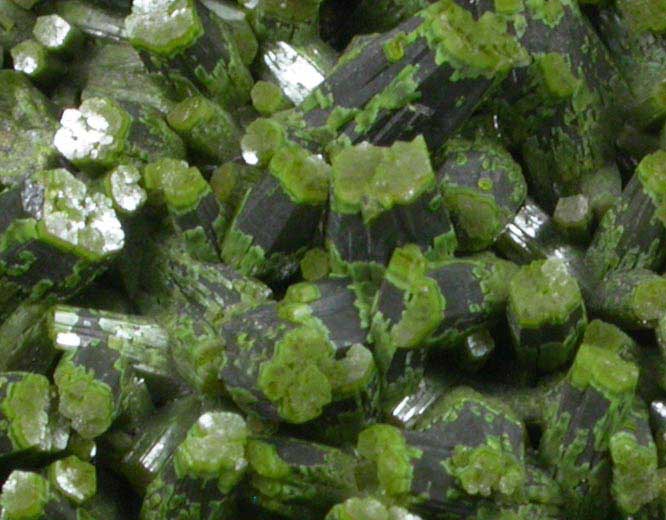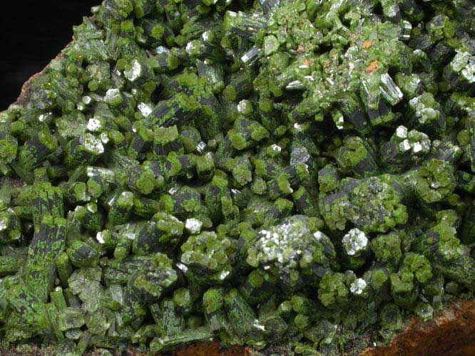 | Description: | Lustrous green pyromorphite crystals covering one face of brown matrix. The pyromorphite crystals are tapered hexagonal prismatic form with flat basal pinacoid terminations, many with hollow (cavernous) terminations. |