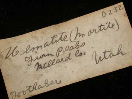 | Description: | Classic specimen of dark-metallic hematite pseudomorphs after octahedral magnetite crystals (a.k.a. Martite) to 18 mm with old pen-and-ink label indicating that Sherk acquired the specimen from Toothaker, a well known Philadelphia mineral collector. Ex. A. Lincoln Sherk II, MD. (1896-1970); ex. Charles R. Toothaker (1873-1952) |