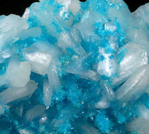 | Description: | Rich cluster of acicular transparent bright-blue cavansite crystals to 3 mm intermixed with translucent white stilbite crystals to 15 mm. The contrast of the blue cavansite against the white stilbite is very attractive. |