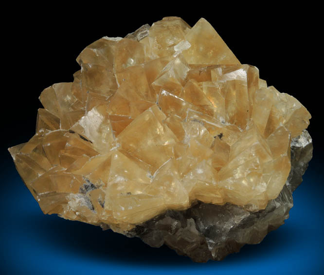 | Description: | Transparent golden-yellow calcite crystals with three-faced rhombohedral terminations. The calcite formed in banded layers of sequential growth and have gray sulfide microscopic inclusions, probably stibnite or marcasite. Fluorescent under SW UV. |