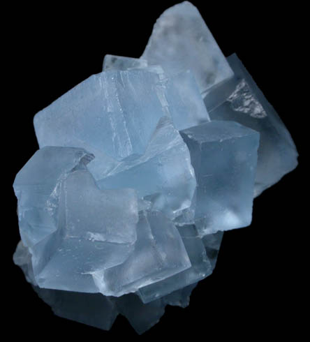 | Description: | Transparent blue cubic fluorite crystals with silky surface luster caused by microscopic crystallization patterns on the surfaces. |