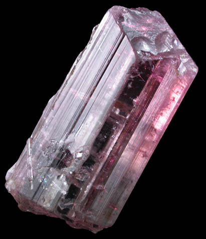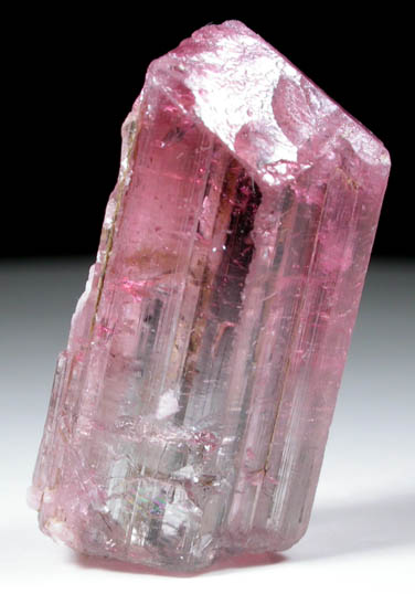 | Description: | Parallel group of transparent rubellite tourmaline crystals, the pink gem variety of the mineral species elbaite, with pyramidal terminations that have convex crystallization patterns on the faces. |