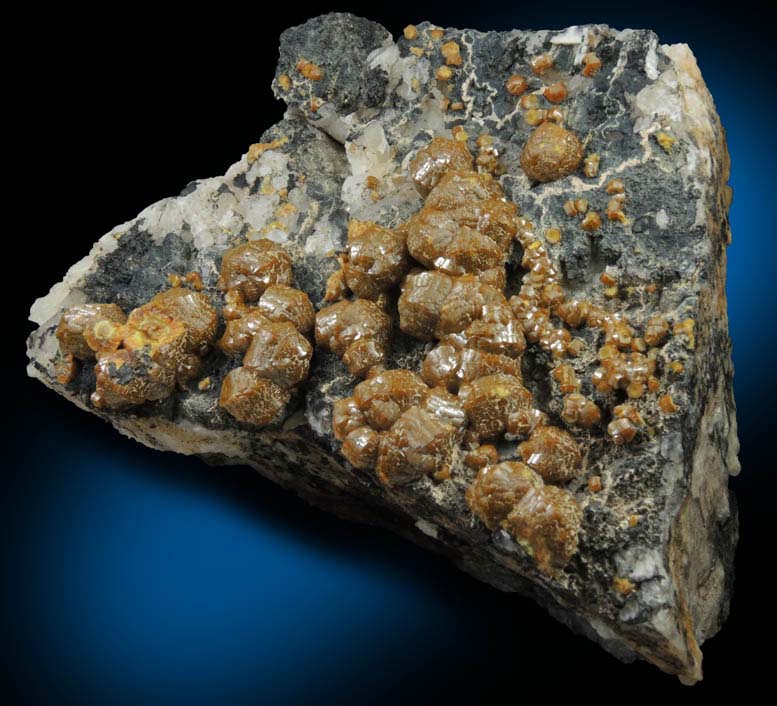 | Description: | Lustrous yellow-brown campylite crystals, the barrel-shaped variety of mimetite, to 6 mm on plate of colorless quartz with black coronadite microcrystals. Two campylite crystals on the lower-left edge contacted the vein wall, all others are undamaged. Ex. L. Sidebottom #372a; ex. Betts #5943 |