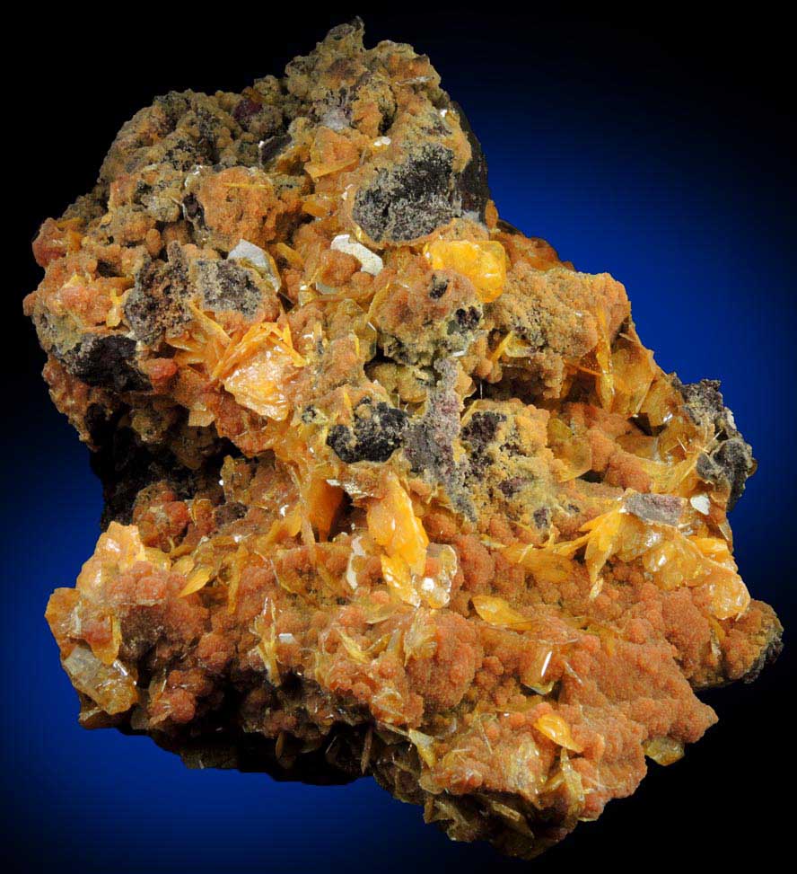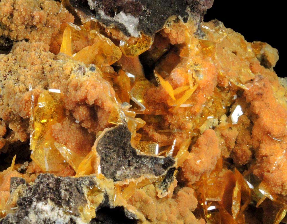 | Description: | Large cluster with many convoluted cavities on all sides lined with lustrous platy transparent-to-translucent yellow-orange wulfenite crystals to 10 mm on translucent orange mimetite crystals in hemispherical aggregates to 6 mm. |