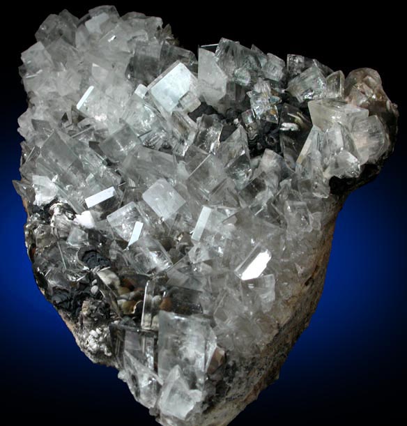 | Description: | Superb water-clear wedge-shaped barite crystals covering one face of tan-colored matrix. The barite crystals formed over botryoidal black oxide mineral (psilomelane?) which are also included inside the barite crystals. Must see in person to appreciate. |