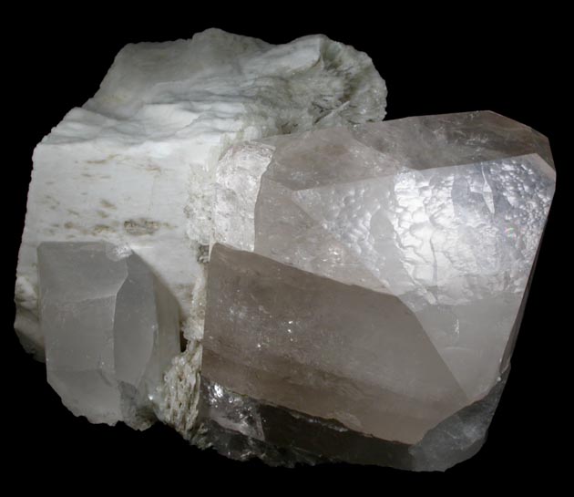 | Description: | Large 65 mm sherry-colored transparent-to-translucent topaz crystal with lustrous crystal faces, on the side of blocky white microcline partial crystal with a small pale-gray partial crystal of quartz. The topaz crystal has internal cleavage flaws. |