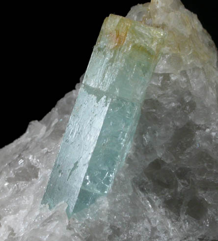 | Description: | Hexagonal transparent-to-translucent aquamarine crystal, the blue-green gem variety of the mineral species beryl, in gray matrix. The lower portion of the aquamarine crystal has good transparency. More of the crystal bottom may be exposed further. Ex. Dr. Donald Miller collection; gift from Joel Sweet |