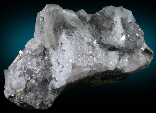 | Description: | Translucent purple-gray cubic fluorite crystals to 30 mm overgrown with lustrous transparent colorless quartz crystals to 10 mm and flattened rhombohedral translucent gray calcite crystals to 20 mm. The fluorite fluoresces violet under SW UV. |