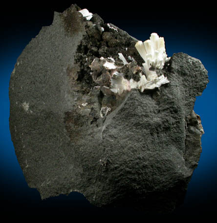 | Description: | Prismatic opaque white natrolite crystals lining a cavity in gray basalt with bladed black hematite microcrystals. For more information see the article: Mineralization at the Fanwood & Summit Quarries, New Jersey in Rocks and Minerals May-June 1987. Ex Jeff Weissman collection #174, attributed to Curt G. Segeler (1901-1989) |