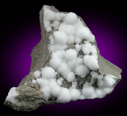 | Description: | Pristine white elongated scalenohedral strontianite crystals in hemispherical aggregates to 5 mm diameter on brown limestone. The strontianite crystals fluoresce white under SW UV illumination. Ex. G. Richards |
