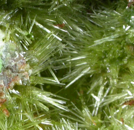 | Description: | Lustrous transparent yellow-green pyromorphite crystals lining shallow cavities in brown gossan. The pyromorphite crystals are unusual acicular habit. Ex. W. Keller #704 |