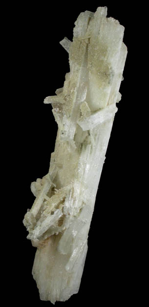 | Description: | Large translucent white natrolite crystals to 90 mm with coating on select faces of microscopic pale yellow-green heulandite crystals from the famous find in 1972-3. See Mineralogical Record v.9 #1 more information on this one-time find. Ex. W. Keller #9383; originally acquired from D. Leavitt, collected ca. 1973 |