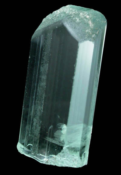 | Description: | Gem-grade aquamarine crystal, the blue gem variety of the mineral beryl, with lustrous prism faces and etched complex termination. Most of the aquamarine is internally flawless with only small surface blemish on the lower rear where it was attached. Weight 8.0 grams |