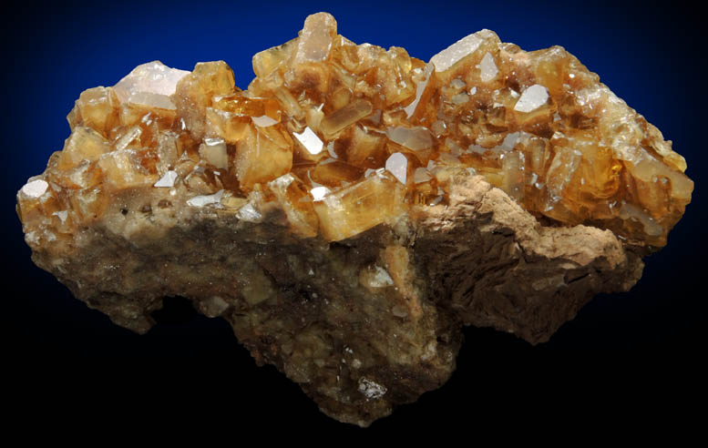 | Description: | Lustrous transparent golden-brown barite crystals on translucent brown crystallized gangue of siderite or ferroan rhodochrosite. The barite crystals are tabular rhombohedral form with {101} edge faces on some crystals. Ex. W. Keller #6054 |