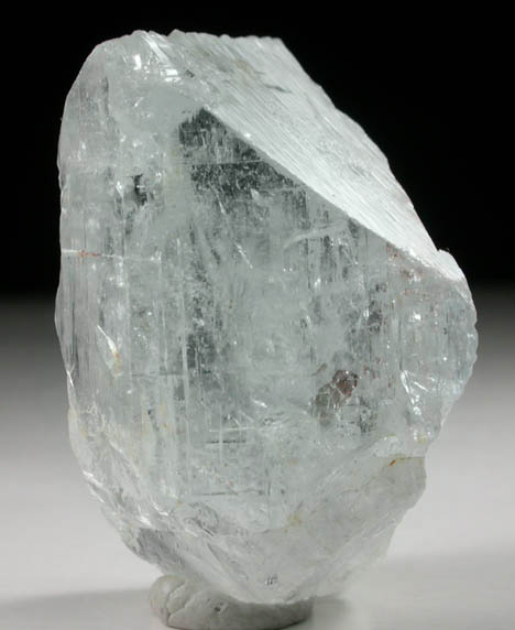 | Description: | Lustrous transparent pale-blue topaz crystal with steep {011} termination faces. The top edge of the topaz crystal has serrated appearance caused by repeated {112} faces. Large areas of the topaz crystal have potential as faceting rough. Weight: 27.3 grams |