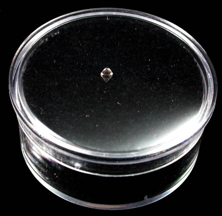 | Description: | Small transparent pale-brown octahedral diamond crystal with smooth, flat crystal faces. Internally the diamond crystal has no flaws and no apparent inclusions. The diamond is enclosed in a circular acrylic case with black background for easy viewing. |