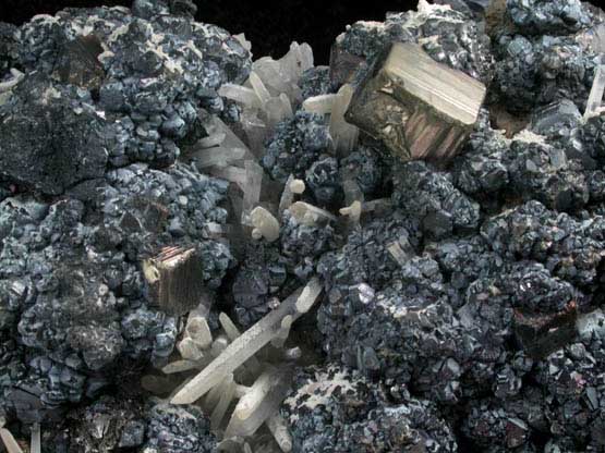 | Description: | Lustrous yellow-metallic cubic pyrite crystals to 9 mm with rich coverage of sphalerite crystals to 3 mm that have a bluish coating on the surfaces plus slender lustrous translucent colorless quartz crystals to 15 mm. |