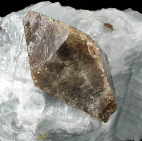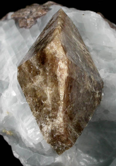 | Description: | Diamond-shaped translucent brown titanite crystal in translucent blue calcite. The titanite crystal has lustrous crystal faces. The calcite was cleaved to expose the titanite crystal, but was subsequently etched in HCL giving the surface a high luster. Ex. Alfred (Fred) DeVito (1937–2004) |