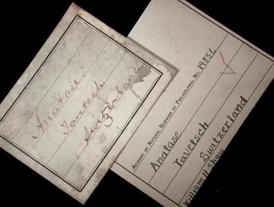 | Description: | Lustrous blue-black anatase crystals in a compact group of crystals on one face of lustrous white quartz crystals on massive quartz. The anatase crystals are tapered elongated-pyramidal form with stepped faces and show blue transparency under 20x. Ex. Academy of Natural Sciences of Philadelphia collection #19856, ex. William H. Shaw (1855-1900) donated in 1922 by his son. |