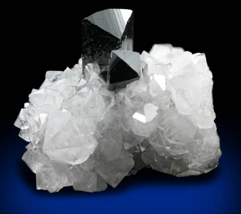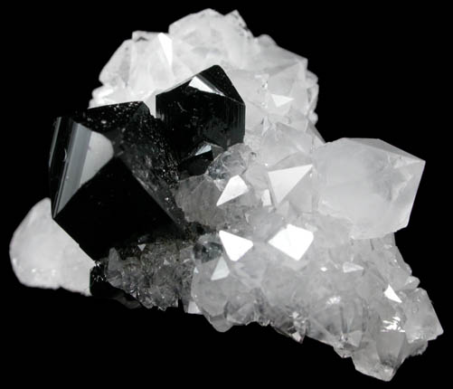 | Description: | Lustrous black prismatic ilvaite crystals to 14 mm surrounded by lustrous transparent-to-translucent colorless quartz crystals to 8 mm with translucent yellow-brown sphalerite on the bottom. |