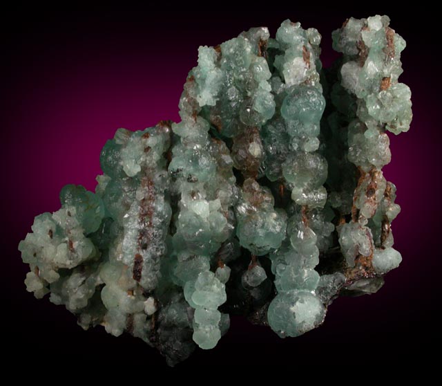 | Description: | Stalactitic groups of translucent green-gray willemite crystals in spherical aggregates to 9 mm diameter with scattered colorless calcite crystals to 1 mm. Under SW UV illumination the willemite fluoresces green-white and the calcite fluoresces orange. |