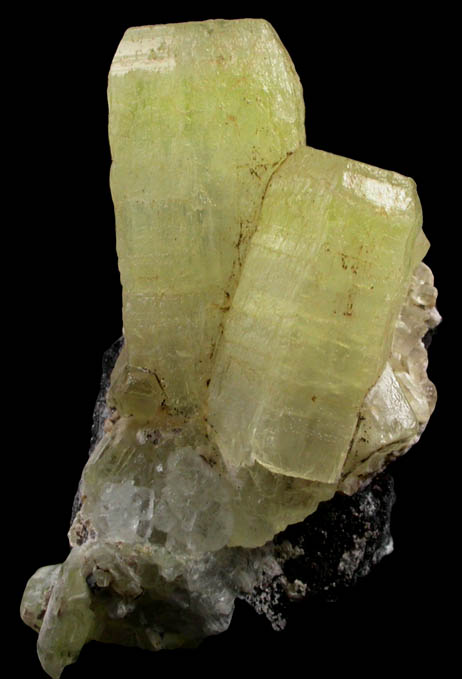 | Description: | Two interconnected transparent-to-translucent yellow ettringite crystals on gray oxide matrix. The ettringite crystals are striated hexagonal prismatic form with tapered pyramidal termination topped with a small basal pinacoid face. |