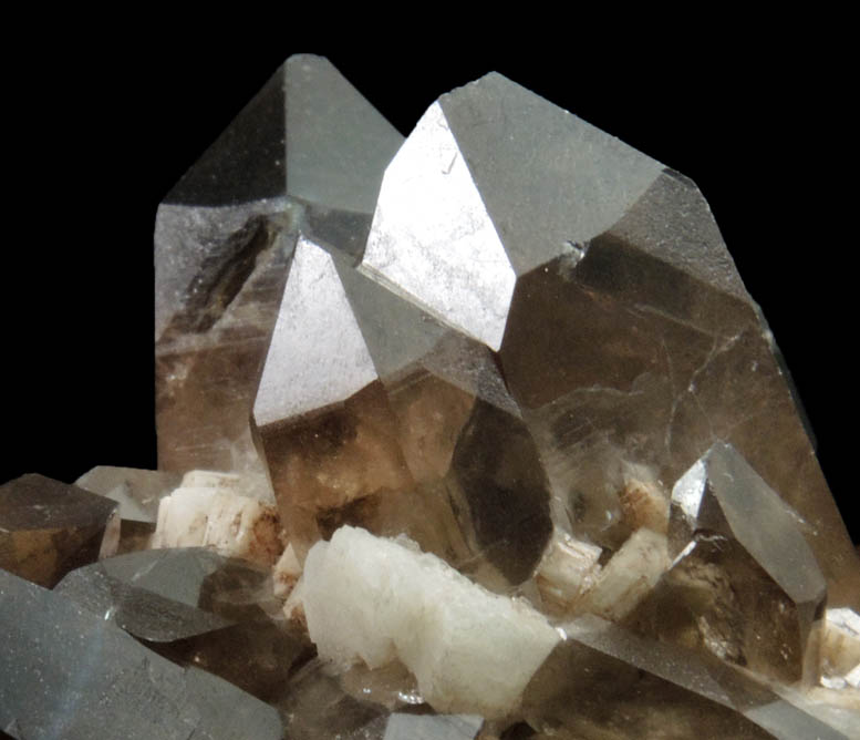 | Description: | Lustrous transparent smoky quartz crystals on one face of white microcline, with etched well-defined {7181} faces on adjacent corners indicating they are twinned following the Dauphiné Law of quartz twinning. Ex. Thomas A. Penney (1934-2019) collection, collected in the 1960s-70s |